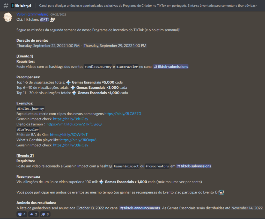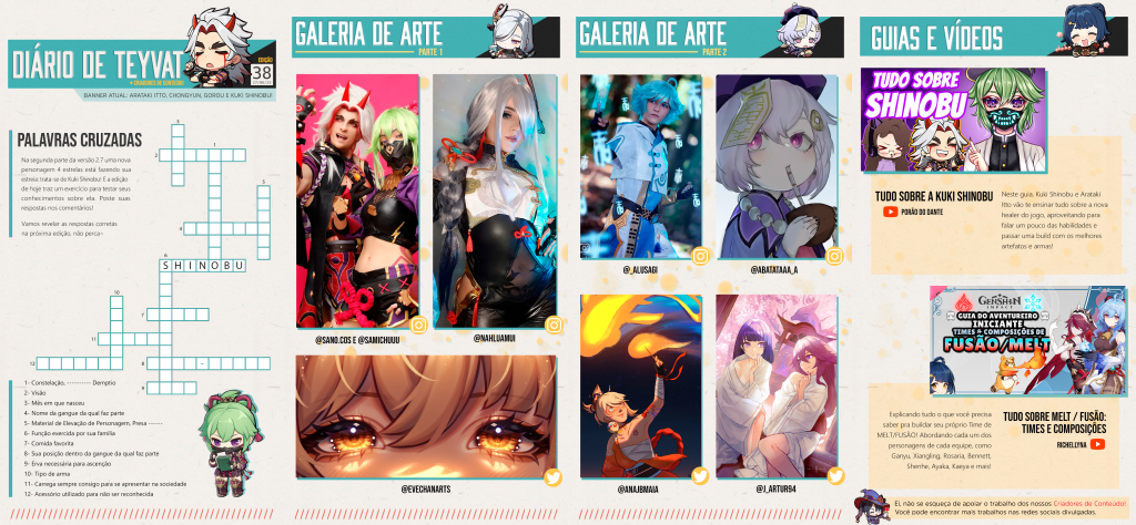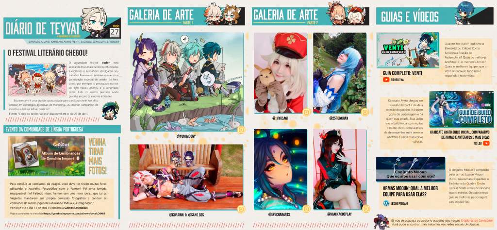 “Diário de Teyvat” was a weekly newsletter featuring Portuguese and Brazilian creators, and also a collaborative work among the Portuguese Community Managers and the Brazilian mods from Discord, Facebook, and HoYoLAB. The newsletter is featured in official Portuguese social media. Main responsibilities: editor and curator since volume no. 07.