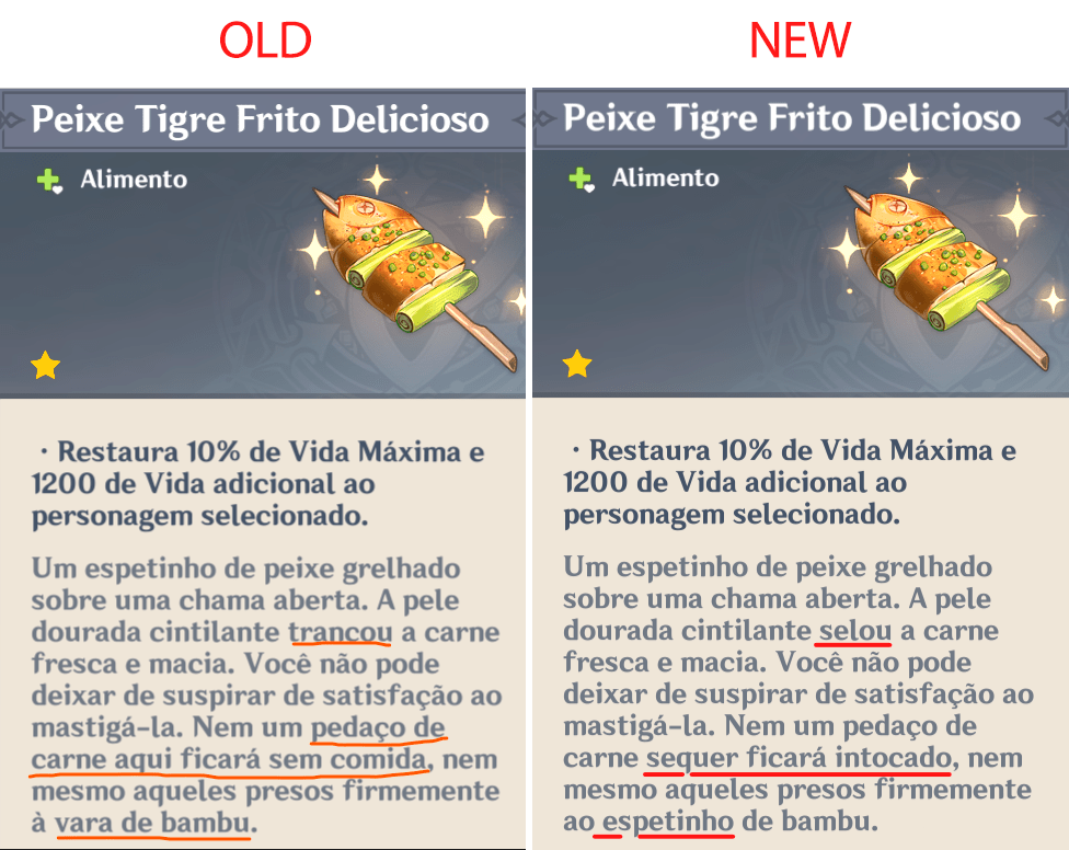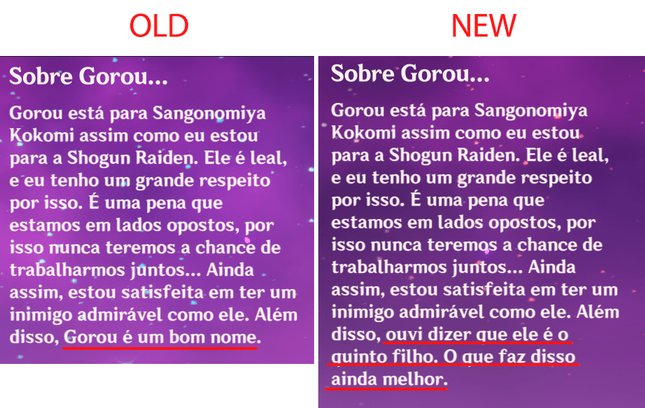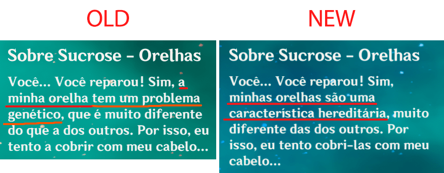 Notable contributions for Portuguese LQA: changing Venti’s nickname (Bardo Surdo > Bardo Desafinado), changing places’ names (Capa do Juramento > Cabo do Juramento; Fazenda Kamisato > Mansão Kamisato), changing too literal translations from English and Chinese (like “light novel”, “stone-faced”, 「三無」, etc.), changing items, talents and profiles’ descriptions for a better understanding, fixing typos.
