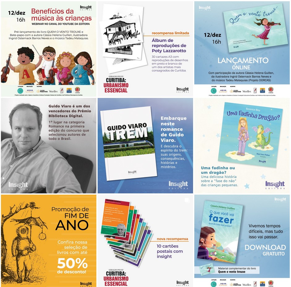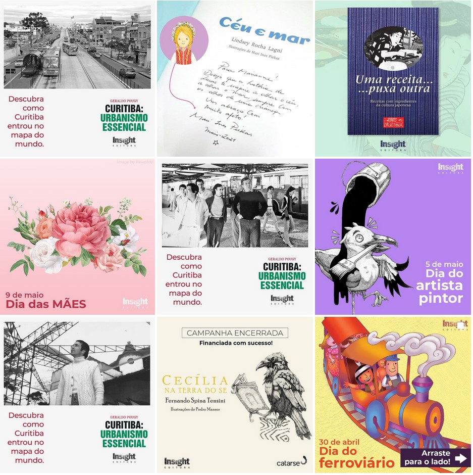 Gerenciamento de mídia social para uma editora de livros no Instagram e Facebook. A empresa tem como alvo um público muito amplo e é tanto B2B quanto B2C. As postagens foram projetadas de acordo com o produto ou campanha, e a descrição sempre foi escrita em linguagem clara e casual.